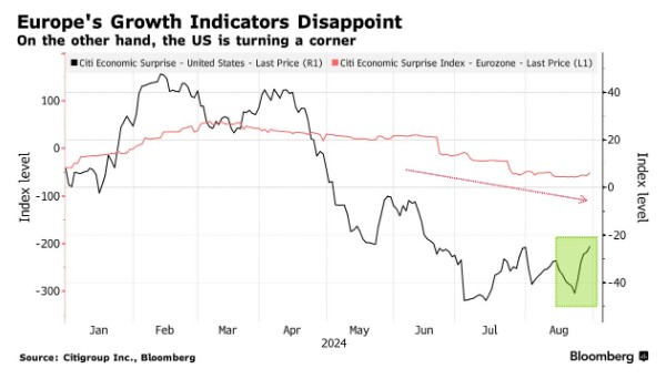 花旗的一项指数显示,自6月以来,整个欧元区的经济数据越来越令人失望,这与美国最近的经济复苏形成了鲜明对比。