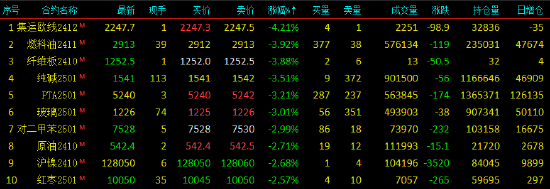 2024年9月2日,期市早盘开盘,国内期货主力合约多数下跌,集运欧线跌超5%,燃油跌超4%,LU燃油、SC原油、PTA跌近3%,沪镍、红枣、玻璃跌超2%。涨幅方面,鸡蛋涨近1%。